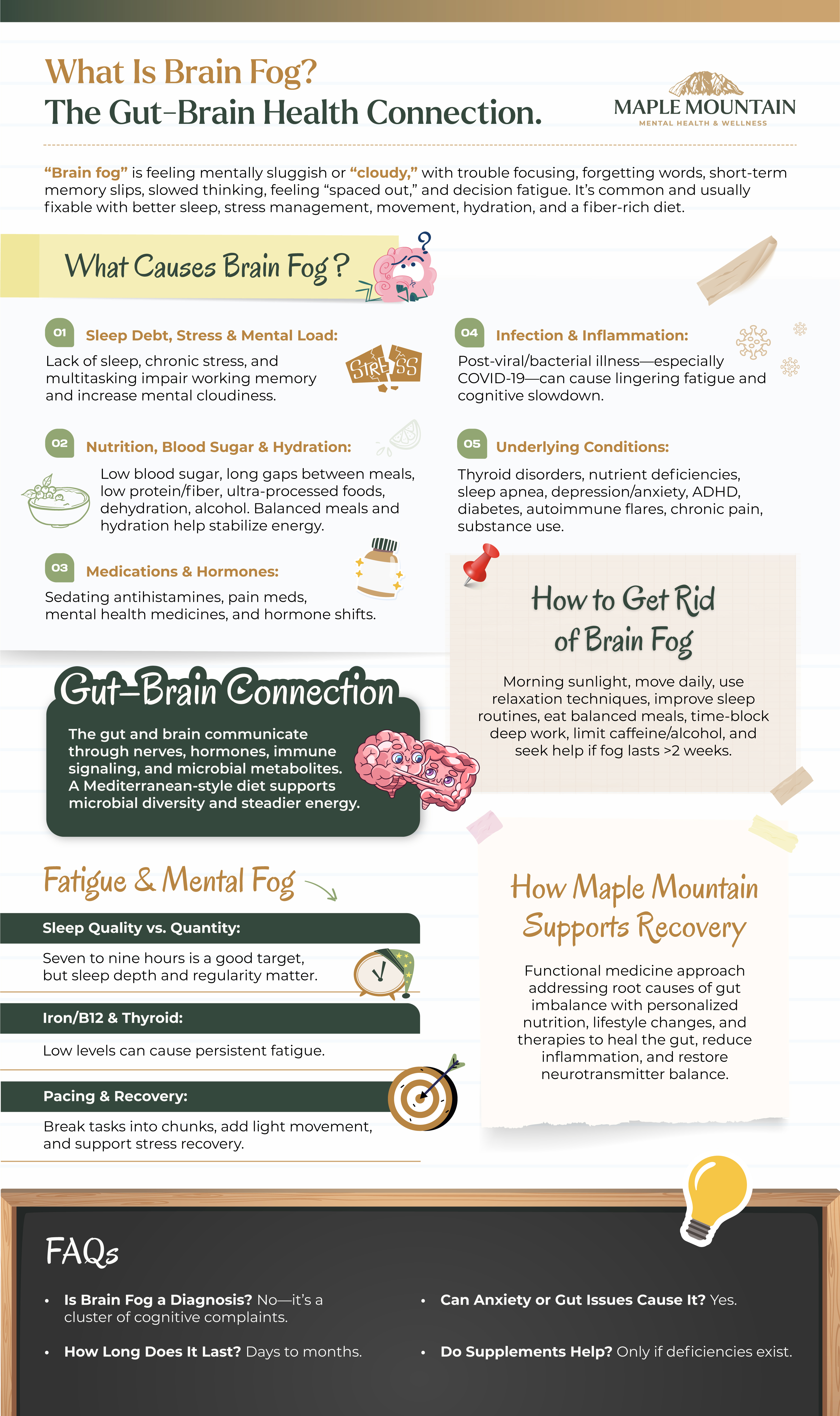 Brain fog is common, frustrating—and usually fixable. Start with better sleep hygiene, stress-coping skills, daily movement, hydration, and a balanced, fiber-rich diet to support the gut–brain axis.